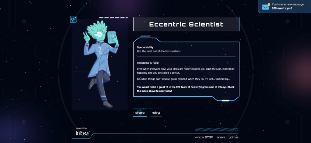 The result is a fun and interactive illustrated story that top programmers can feel was crafted specially for them, and increases their desire to join Infosys' team STG.