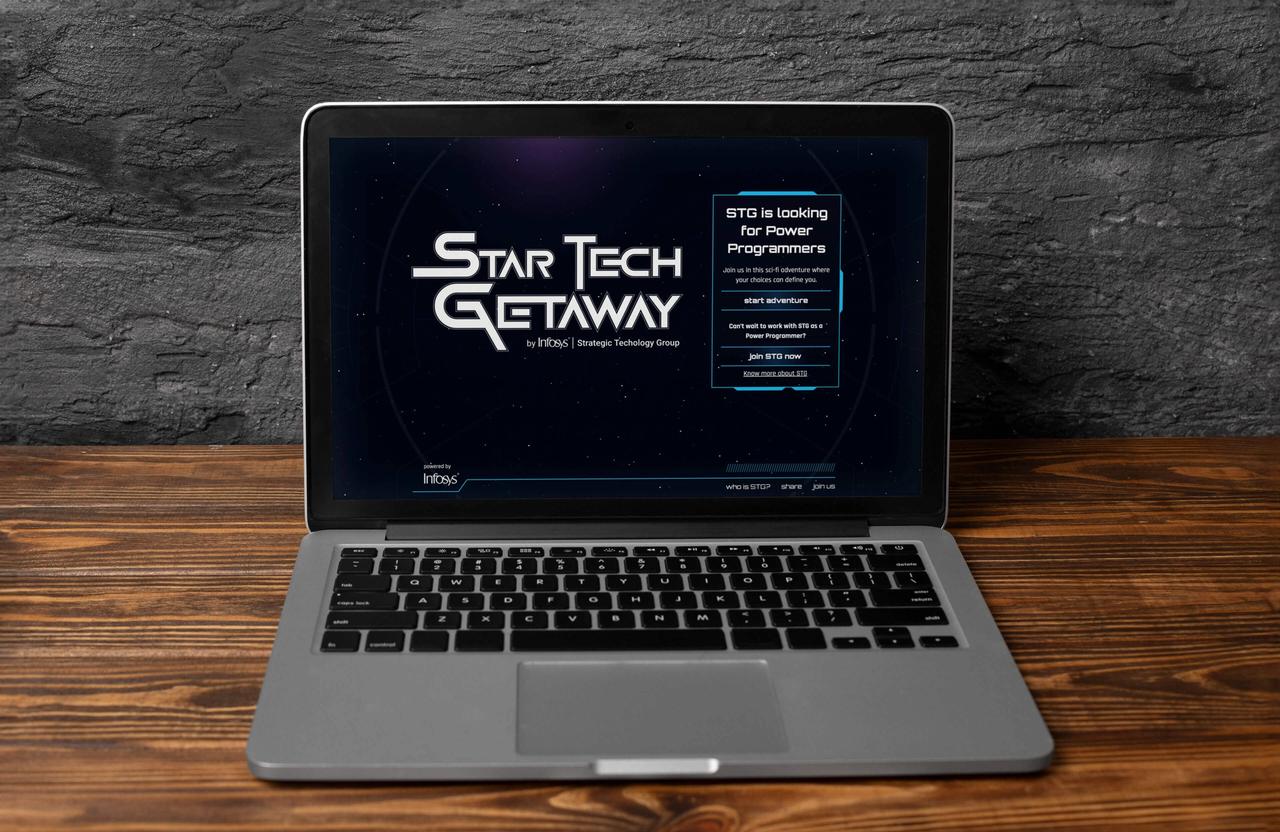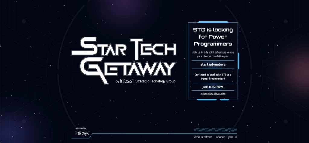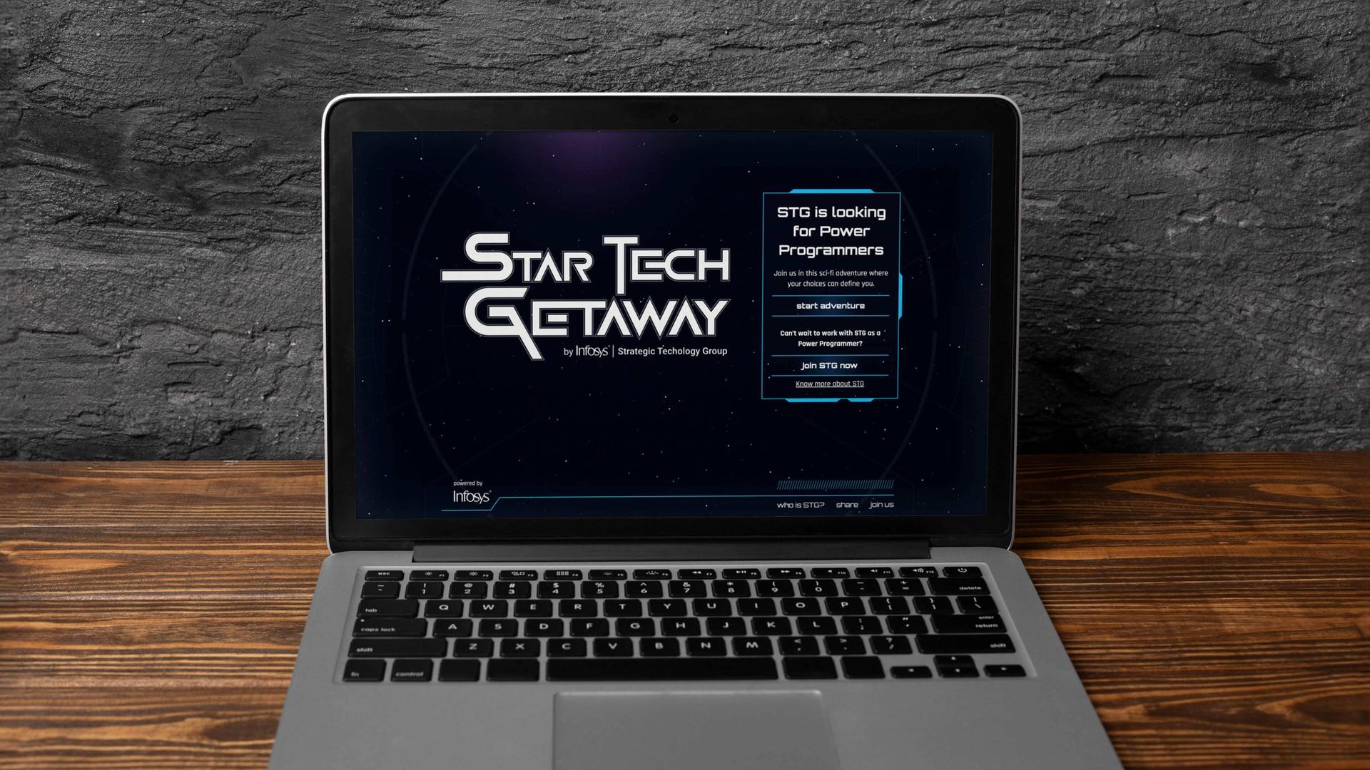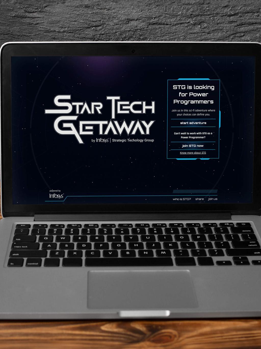 Infosys wanted a creative way to recruit top programmers for their team STG (Strategist Technology Group), and since we had already built a very successful creative quiz for them for internal usage (the Super Dev Quiz in our portfolio), we thought to expand on the idea and this time do a "interactive story" quiz instead, with right and wrong choices to increase the engagement.
