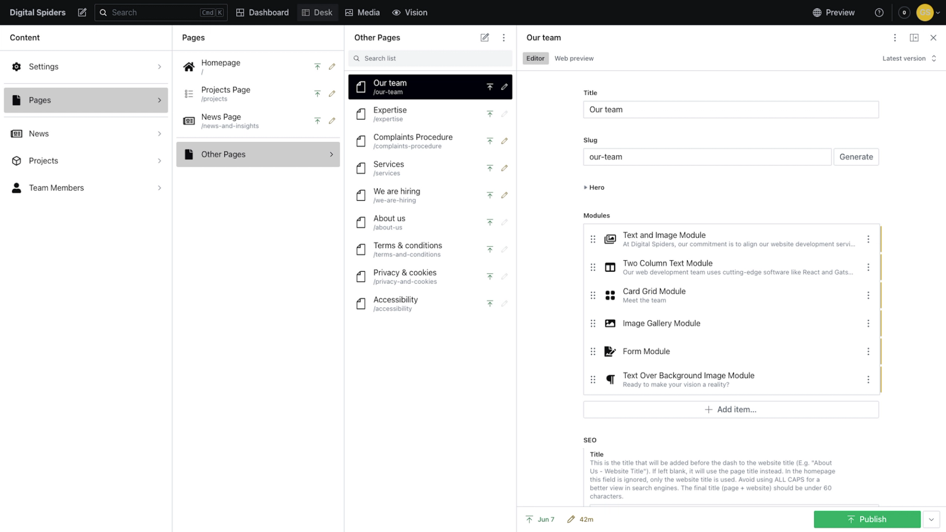 We want you to be in control of your own website. As such, our websites come with a backoffice (CMS) built on top of the Sanity service, providing an amazing editor experience.