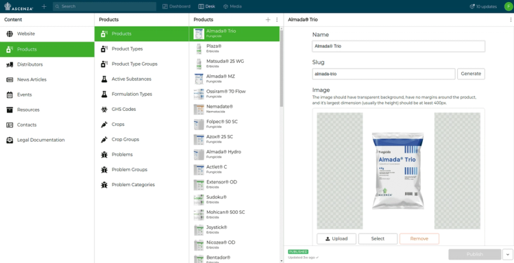 ASCENZA, a multi-national company in the crop protection sector, came to us with a very interesting challenge: they were going through a rebranding and they wanted to use this as an opportunity to redesign their four existing websites (for Portugal, Spain, France and Italy) using a common design and codebase that could easily be used by their other countries without websites.